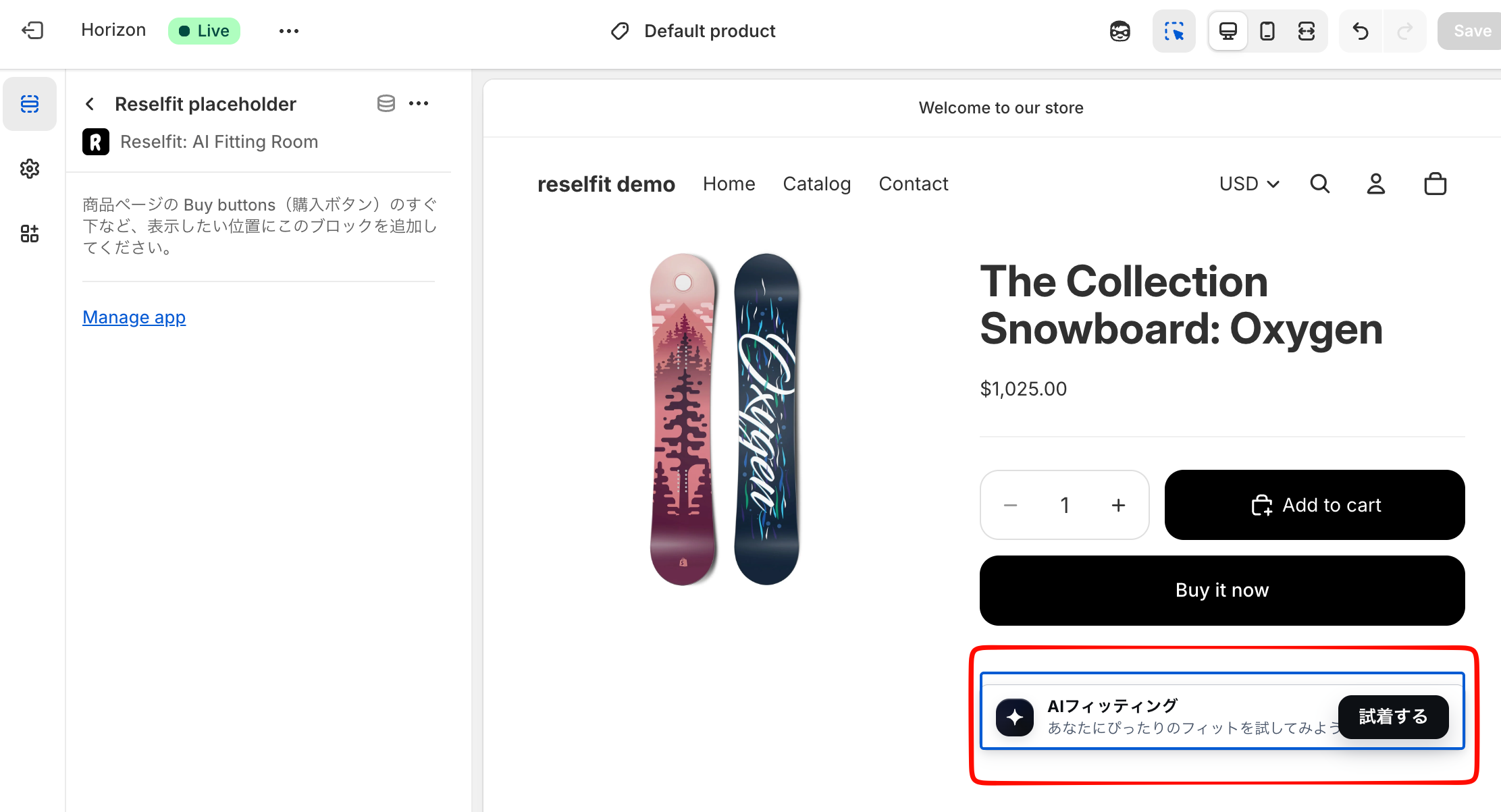 <reselfit-plugin-placeholder>上へ Plugin ボタンが描画され、クリックでモーダルが起動することを確認します。 - 期待どおりに動作したらShopifyテーマを公開してください。