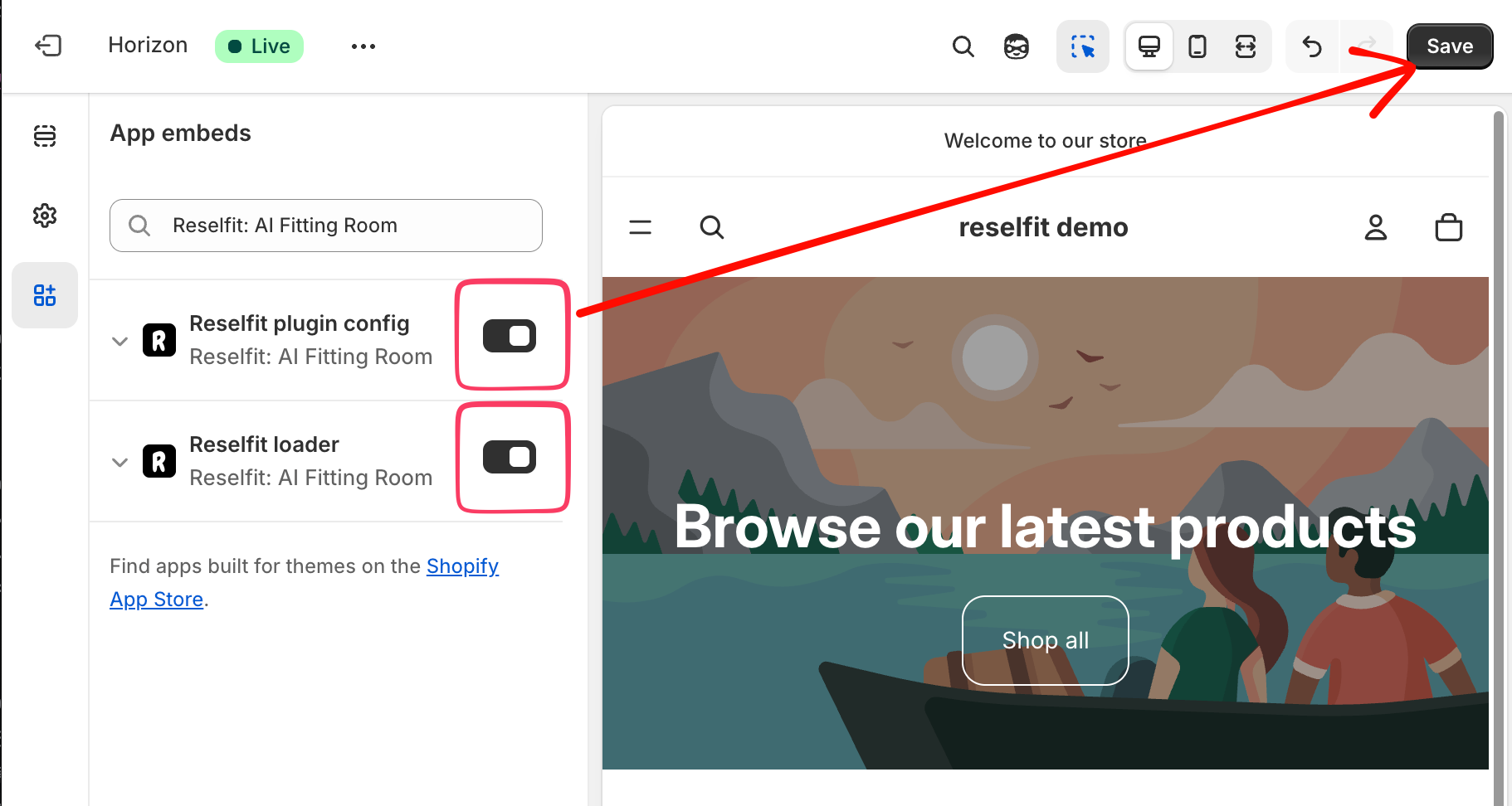 遷移先のShopifyテーマ編集画面で「Reselfit loader」がONになっていることを確認してください。